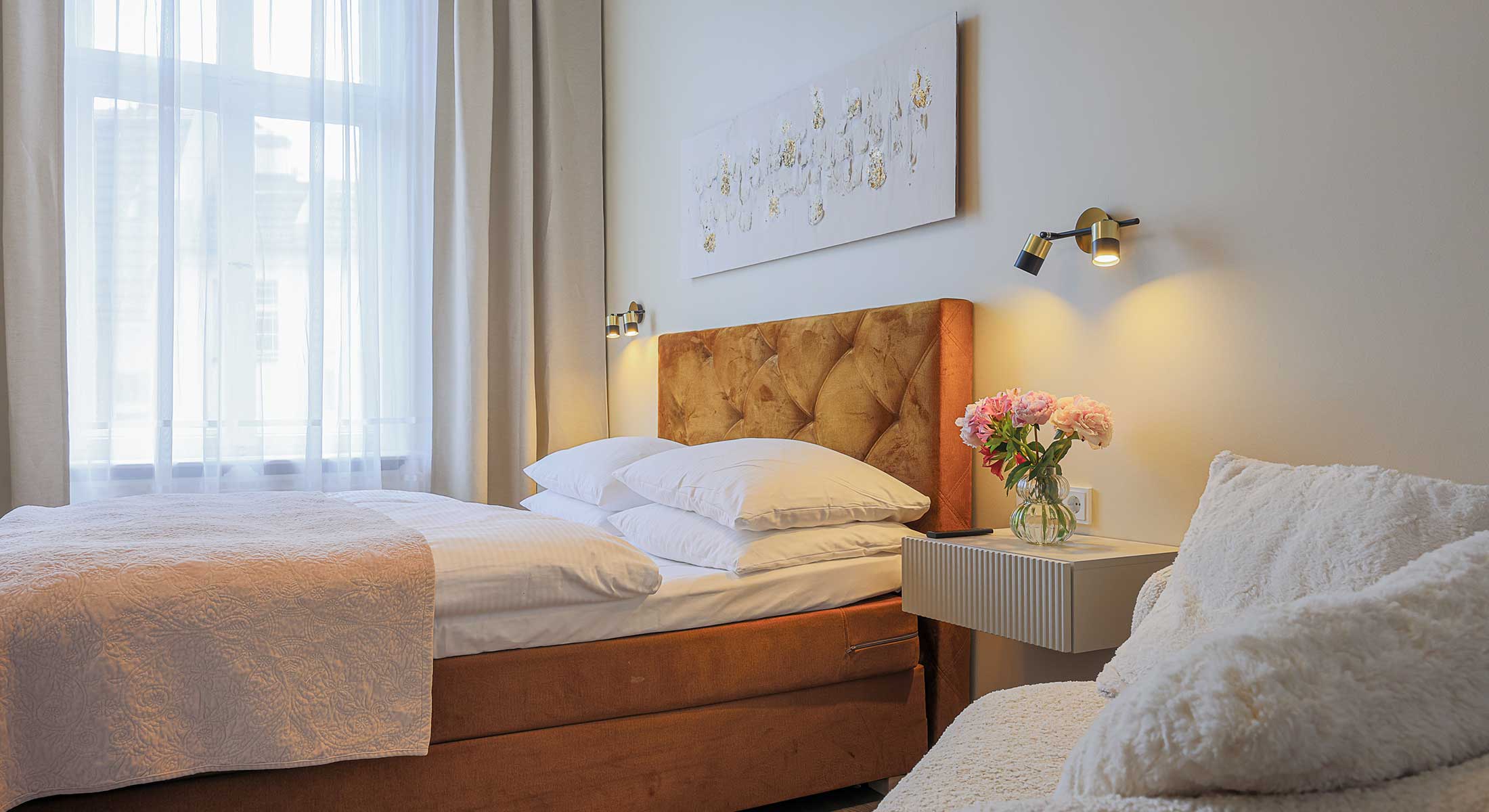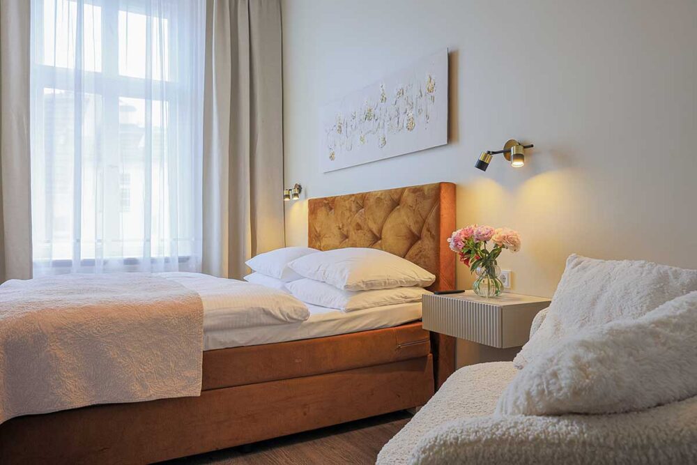 Suchen Sie ein Hotel-Doppelzimmer in Berlin mit Charakter? Dann entscheiden Sie sich für eines unserer zehn Standard-Doppelzimmer. Einige bieten blumige Bettwäsche mit lebhaften Tapeten, andere moderne Akzente mit eleganten, minimalistischen Designs, und andere wiederum sind mit Gemälden unserer Stadt verziert. Sie können Ihr Zimmer auch nach dessen Aussicht auswählen – jedes Zimmer bietet einen Blick auf die Fasanenstraße, den Innenhof oder den Kurfürstendamm.